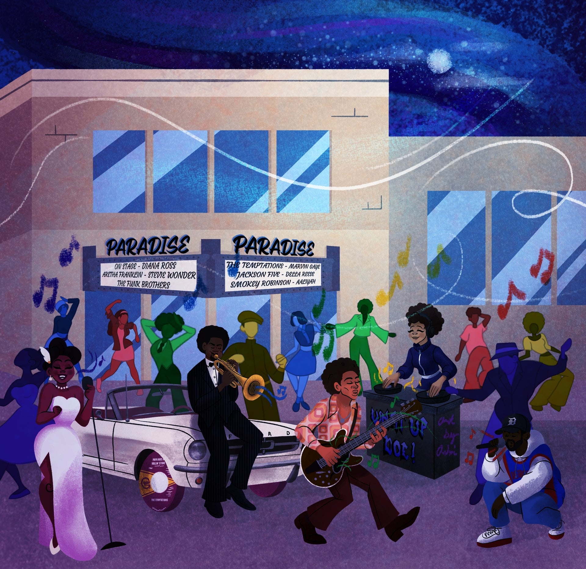 Celebrate the heartbeat of Detroit’s music scene with Detroit Sinners, a digital painting inspired by the city’s legendary and iconic musical history. This moonlit scene brings together musicians from across Detroit’s eras — such as blues, jazz, Motown, soul, techno, and rap — performing in the streets outside the historic Paradise Theatre, while dancers fill the night with movement and joy.
